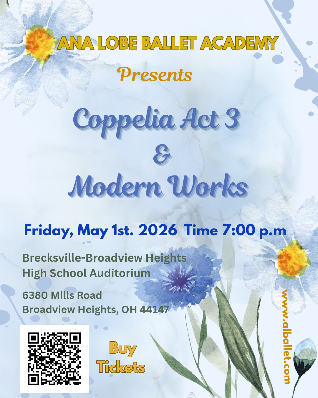 ANA LOBE BALLET ACADEMY PRESENTS: Coppelia Act 3 & Modern WorksDATE: Friday, May 1st, 2026 Time 7:00 p.m.LOCATION: Brecksville-Broadview Heights High School Auditorium 6380 Mill Road Broadview Heights, OH 44147 TICKETS Program